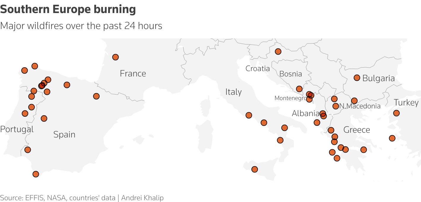 Το «κοκτέιλ μολότοφ» των ανέμων και των υψηλών θερμοκρασιών που καταγράφονται σε όλη τη νότια Ευρώπη, σε συνδυασμό με εμπρησμούς, έχουν προκαλέσει πυρκαγιές σε όλες σχεδόν χώρες της Νότιας Ευρώπης. Η Μεσόγειος είναι περιοχή του πλανήτη που θερμαίνεται περισσότερο και γρηγορότερα από άλλες.