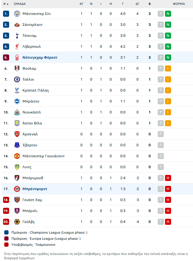 Ιδανικό… ποδαρικό έκανε η Νότιγχαμ Φόρεστ στη φετινή Premier League. Σκοράροντας τρεις φορές στο εκπληκτικό πρώτο της ημίχρονο, η ομάδα του Νούνο επικράτησε άνετα με 3-1 της Μπρέντφοντ στο «City Ground» για την πρεμιέρα του πρωταθλήματος και έστειλε από νωρίς μήνυμα προς πάσα κατεύθυνση. Σε εξαιρετική κατάσταση ο περσινός πρώτος σκόρερ της, Γουντ, που πέτυχε δύο γκολ, ενώ σκόραρε στο ντεμπούτο του ο Εντόι. Πριν τη σέντρα παρουσιάστηκαν στο κοινό της ομάδας τα δύο νέα μεταγραφικά αποκτήματα, Χάτσινσον και ΜάκΑτι.