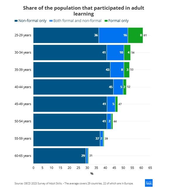 Το 2023, μόνο το ένα τρίτο των ατόμων ηλικίας 60-65 ετών συμμετείχε σε προγράμματα εκπαίδευσης ενηλίκων κατά τους 12 μήνες πριν από την έρευνα, σε σύγκριση με περισσότερο από το ήμισυ των ατόμων ηλικίας 25-44 ετών. Οι μέσοι όροι καλύπτουν 29 χώρες, 22 από τις οποίες βρίσκονται στην Ευρώπη.