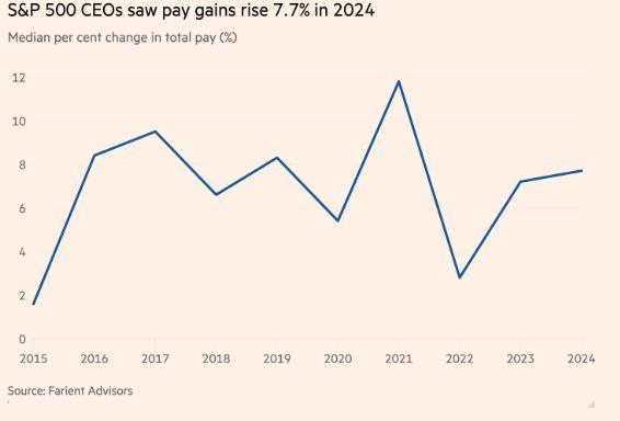 Οι αμοιβές των διευθυνόντων συμβούλων (CEO) του S&P 500 αυξήθηκαν κατά 7,7% πέρυσι, καθώς τα πακέτα στις μεγαλύτερες εταιρείες των ΗΠΑ συνεχίζουν να αυξάνονται, όπως επισημαίνουν οι Financial Times.