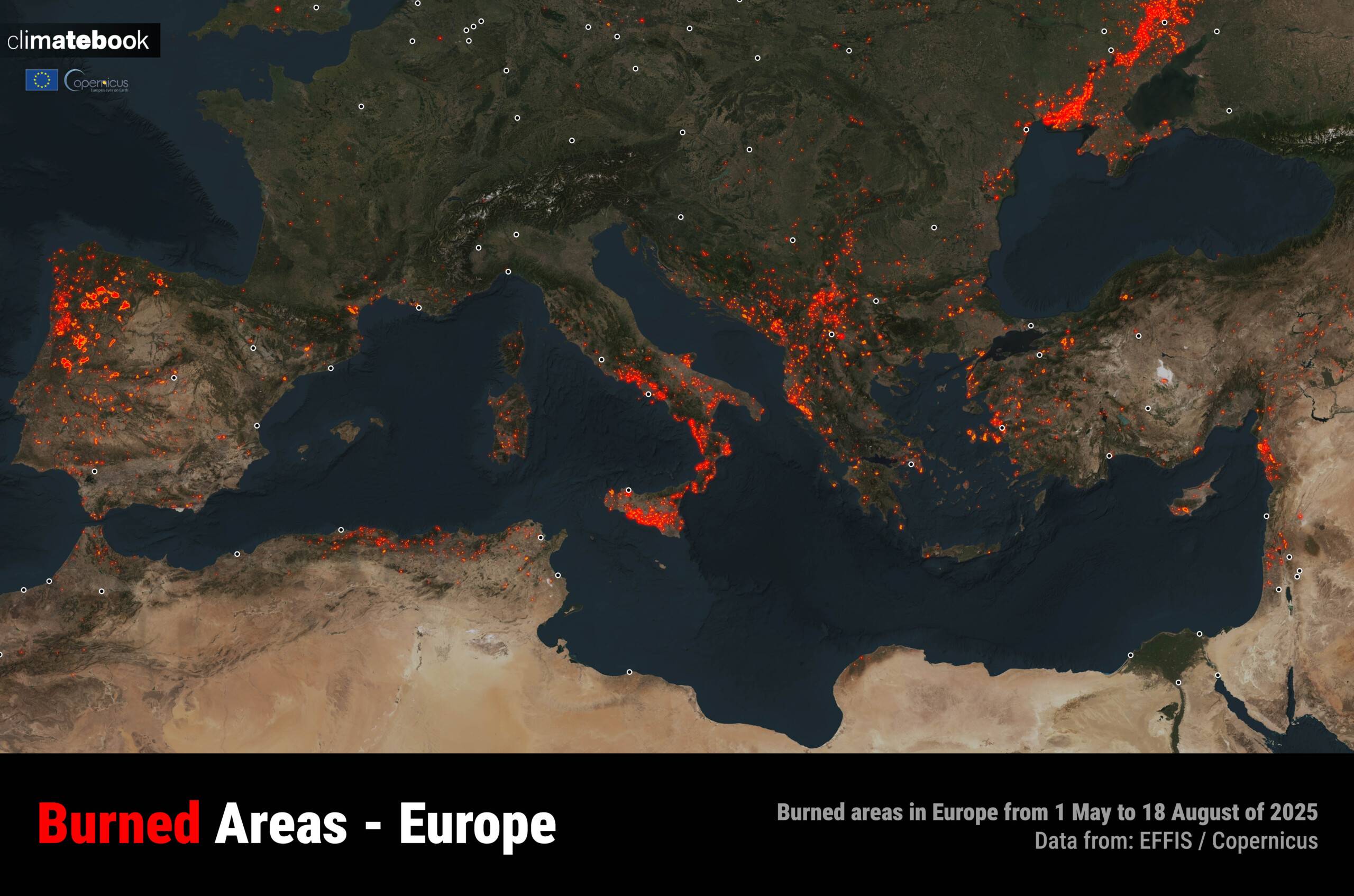 Το Climatebook, επικαλούμενο στοιχεία του Ευρωπαϊκού Συστήματος Πληροφοριών για τις Δασικές Πυρκαγιές (EFFIS), επισημαίνει ότι έως τις 18 Αυγούστου 2025 είχαν καεί περισσότερα από 880.000 εκτάρια γης. Δηλαδή πάνω από 8,8 εκατομμύρια στρέμματα.