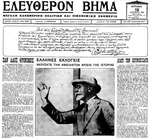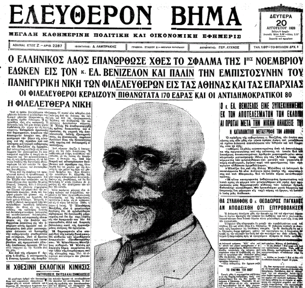 Το πρωτοσέλιδο του «Ελευθέρου Βήματος» που είχε κυκλοφορήσει τη Δευτέρα 20 Αυγούστου 1928 ήταν εξ ολοκλήρου αφιερωμένο στον εκλογικό θρίαμβο που είχε καταγάγει ο Ελευθέριος Βενιζέλος την προτεραία, Κυριακή 19 Αυγούστου.