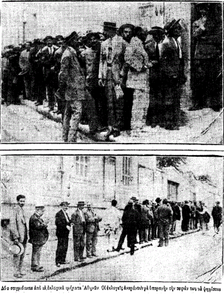 Οι πρόσφυγες εκλογείς προσέρχονται εις τας κάλπας ζητωκραυγάζοντες ενθουσιωδώς υπέρ του Βενιζέλου και του συνδυασμού του και ψηφίζοντες απροκαλύπτως αυτόν.