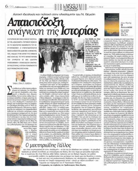 *Κριτικό κείμενο του διαπρεπούς συνταγματολόγου και συγγραφέα Νίκου Αλιβιζάτου, που έφερε τον τίτλο «Απαισιόδοξη ανάγνωση της Ιστορίας» και είχε δημοσιευτεί στην εφημερίδα «Τα Νέα» το Σαββατοκύριακο 11-12 Οκτωβρίου 2003.
