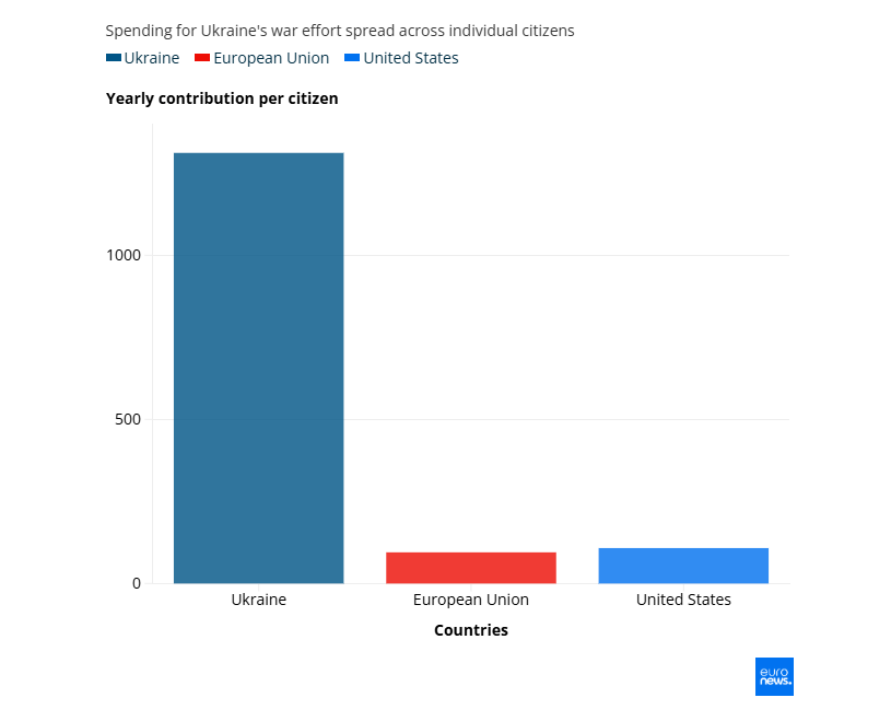 To Euronews στη συνέχεια προχωρά στον υπολογισμό του τι πληρώνει ο κάθε μεμονωμένος πολίτης για την ενίσχυση των πολεμικών αναγκών σε ΕΕ, ΗΠΑ και Ουκρανία.
