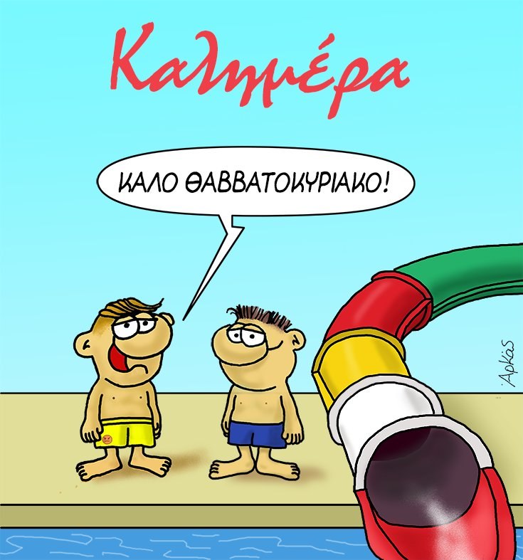 Στο σημερινό σκίτσο τα δύο πιτσιρίκια φορούν μαγιό και είναι έτοιμα να κάνουν νεροτσουλήθρα με τον Θανασάκη να εύχεται με τη χαρακτηριστική προφορά του: