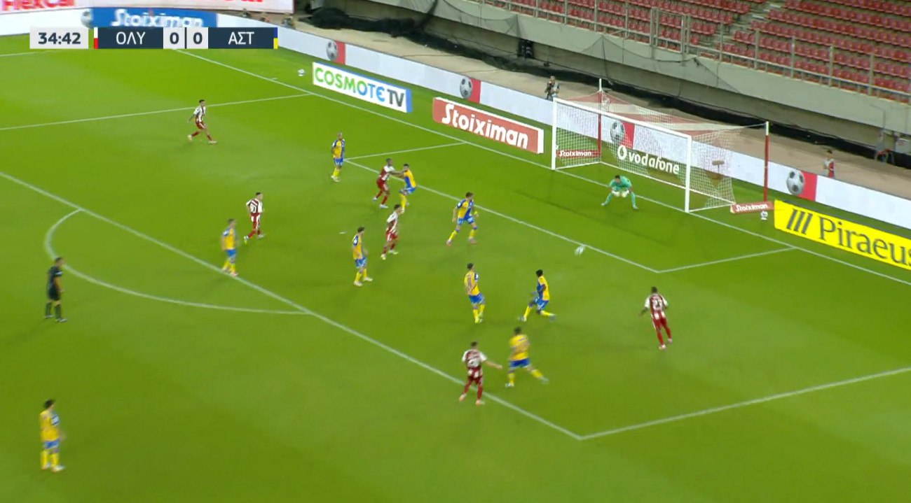 Ο Κοστίνια ήταν ο πρωταγωνιστής δύο καλών ευκαιριών του Ολυμπιακού στο 35΄και στο 37′, με τον Πορτογάλο αμυντικό να γίνεται απειλητικός για την εστία του Τσιντώτα.