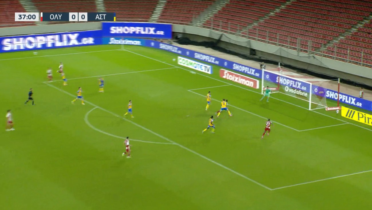 Ο Ολυμπιακός πιέζει από το ξεκίνημα του αγώνα τον Αστέρα και ψάχνει το πρώτο του επίσημο γκολ της χρονιάς, με το οποίο θα ανοίξει τον δρόμο προς την κατάκτηση των τριών βαθμών.