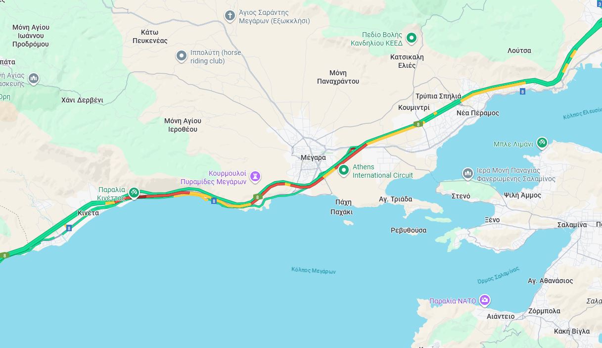 Αυτή την ώρα παρατηρείται αυξημένη κίνηση στην Ολυμπία Οδό. Συγκεκριμένα, το κομμάτι από τους Αγίους Θεοδώρους μέχρι τη Νέα Πέραμο αντιμετωπίζει προβλήματα, αλλά όχι μεγάλης κλίμακας μέχρι στιγμής.