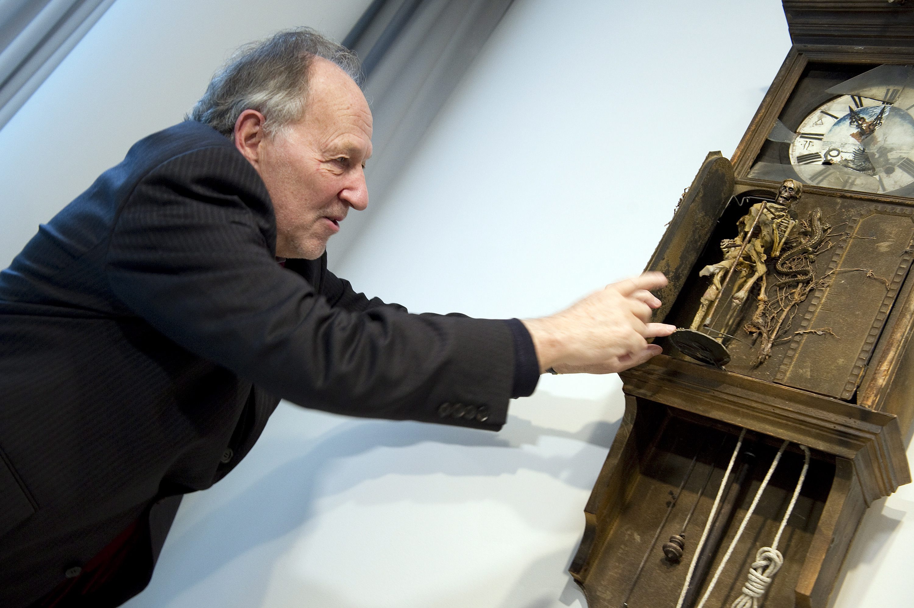 Φωτογραφία: Ο Γερμανός σκηνοθέτης και πρόεδρος της κριτικής επιτροπής της Berlinale 2010, Βέρνερ Χέρτζογκ, ποζάρει με ένα ρολόι από την ταινία του «Nosferatu», μέρος της «Συλλογής Βέρνερ Χέρτζογκ», καθώς το δωρίζει στη Γερμανική Κινηματογραφική Ταινιοθήκη στο Βερολίνο, Γερμανία, 16 Φεβρουαρίου 2010.EPA/ARNO BURGI