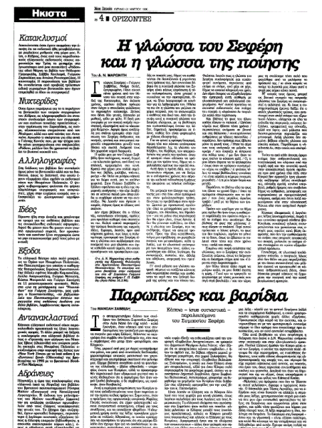 *Κείμενο του φιλολόγου Μανόλη Σαββίδη (γιου του διαπρεπούς μελετητή και καθηγητή της νεοελληνικής λογοτεχνίας Γ. Π. Σαββίδη), που έφερε τον τίτλο «Παρωπίδες και βαρίδια» και είχε δημοσιευτεί στην εφημερίδα «Το Βήμα» την Κυριακή 31 Μαρτίου 1996. Το «Β’ Συμπόσιο Γιώργου Σεφέρη, εις μνήμην Γ. Π. Σαββίδη» είχε πραγματοποιηθεί στην Αγία Νάπα της Κύπρου στις 16-18 Μαρτίου 1996.