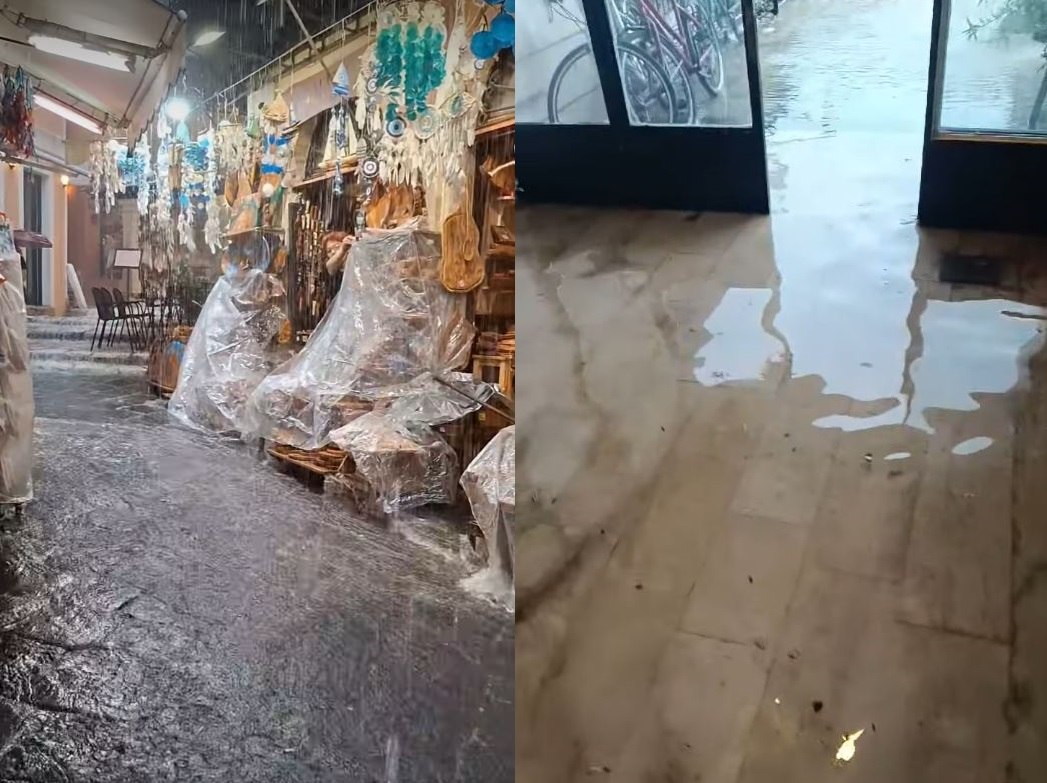 Η βροχή αρχικά συνοδεύτηκε από ισχυρούς άνεμους, ενώ βρήκε απροετοίμαστους πολλούς τουρίστες οι οποίοι είτε με αδιάβροχα μίας χρήσης, είτε με σακούλες προσπαθούσαν να προφυλαχτούν και να βρουν έστω ένα υπόστεγο.
