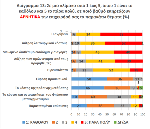Ειδικότερα, το 59% των ερωτηθέντων ανέφερε ότι η ακρίβεια επηρεάζει αρνητικά την επιχείρησή του πάρα πολύ και ακολουθεί το λειτουργικό κόστος με 52%, το μειωμένο εισόδημα για αγορές με 40%, η αύξηση τιμών αγοράς από προμηθευτές 39% και η ρευστότητα 18%.