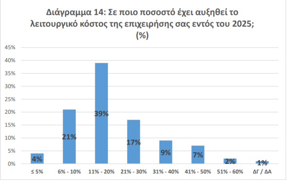 Αξιοσημείωτο είναι επίσης το γεγονός ότι τρεις στις τέσσερις επιχειρήσεις (74%) αναφέρει πως το λειτουργικό της κόστος έχει διογκωθεί περισσότερο από 10% από τις αρχές του έτους έως σήμερα.