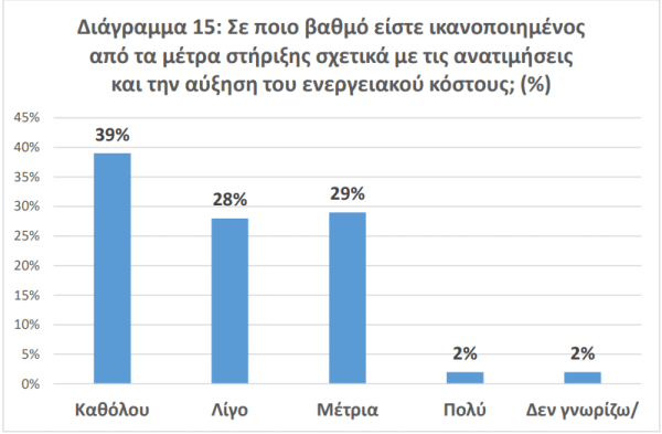 Επιπλέον, στο πλαίσιο αυτό, το 67% των επιχειρηματιών δηλώνει από καθόλου έως λίγο ανακουφισμένο από τα μέτρα στήριξης έναντι των ανατιμήσεων και αύξησης του ενεργειακού κόστους.