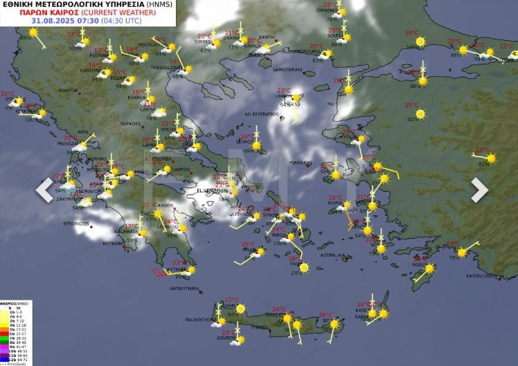 Θερμοκρασία: Από 19 έως 32 βαθμούς Κελσίου. Στην Ήπειρο και το Ιόνιο θα είναι 2 με 3 βαθμούς χαμηλότερη.