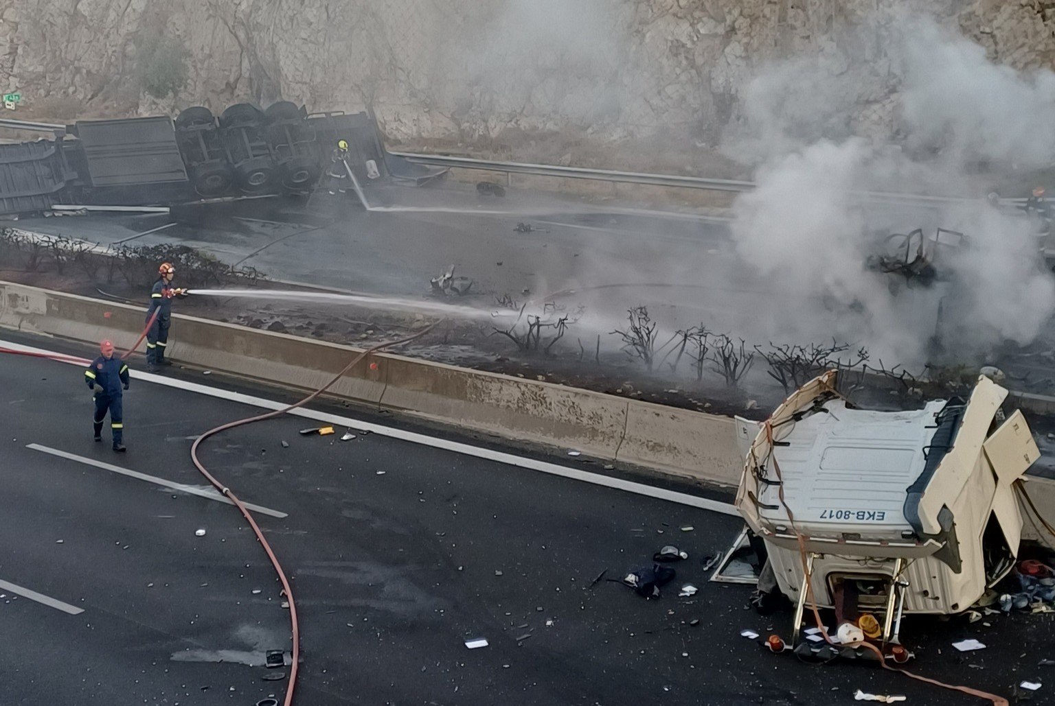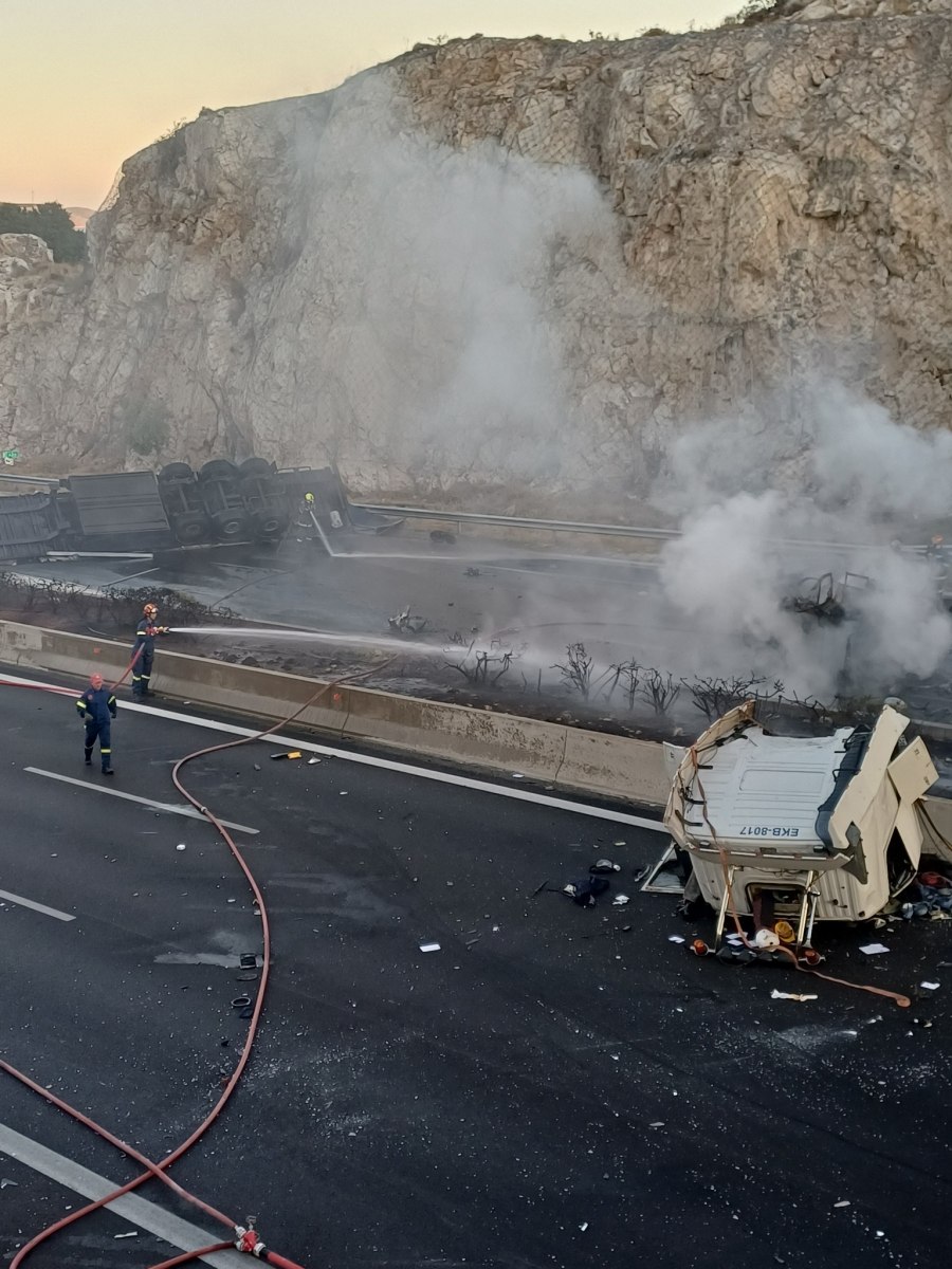 Από τη σφοδρή σύγκρουση το μεγάλο φορτηγό τυλίχθηκε στις φλόγες. Σύμφωνα με τις πρώτες πληροφορίες υπάρχει ένας τραυματίας, ο οδηγός της νταλίκας.