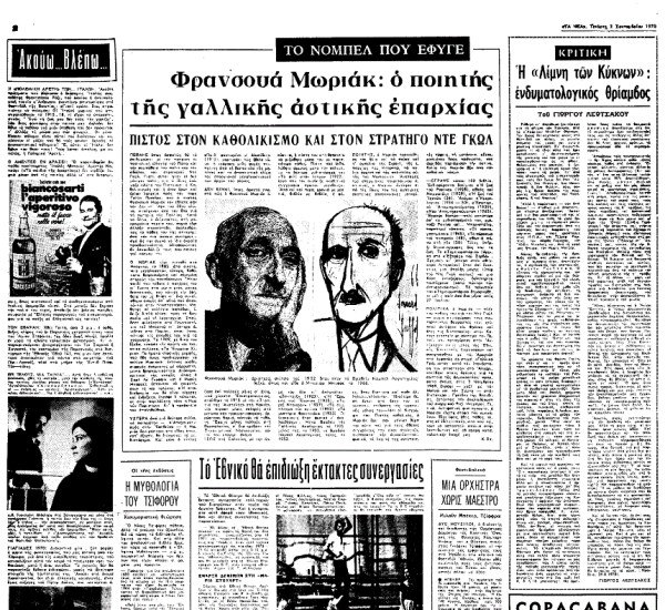 *Άρθρο που έφερε τον τίτλο «Φρανσουά Μωριάκ: ο ποιητής της γαλλικής αστικής επαρχίας» και είχε δημοσιευτεί στην εφημερίδα «Τα Νέα» την Τετάρτη 2 Σεπτεμβρίου 1970, την επομένη του θανάτου του Φρανσουά Μωριάκ.