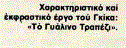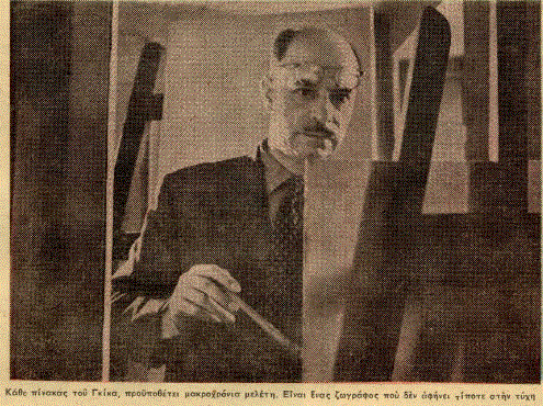 Μια ανάλυσις λεπτομερέστερη του έργου του Γκίκα θα έβγαινε από την γενικότητα που πρέπει να έχη ένα τέτοιο σημείωμα· και τελειώνω με την έκφρασι της μεγάλης μου χαράς γιατί η έκθεσίς του στο Βρεττανικό Ινστιτούτο στο Κολωνάκι μού δίνει την ευκαιρία να γράψω έστω και τα λίγα αυτά λόγια για τον παιδικό μου φίλο, που γι’ αυτόν αισθάνομαι σήμερα υπερήφανος όχι μόνο σαν φίλος αλλά και σαν Έλληνας.