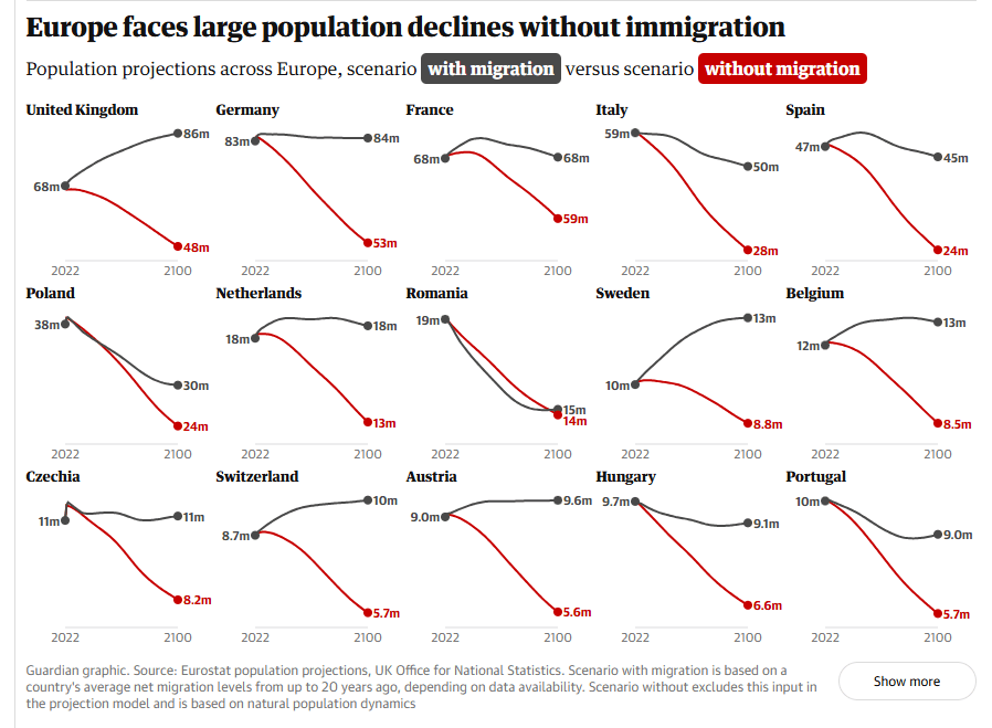 Χαρακτηριστικό είναι ότι στην Ιταλία, που η ακροδεξιά πρωθυπουργός Τζόρτζια Μελόνι, έχει θέσει ως προτεραιότητα την καταπολέμηση της μετανάστευσης, ο πληθυσμός θα μειωνόταν κατά το ήμισυ μέχρι το τέλος του αιώνα με μηδενικές αφίξεις.