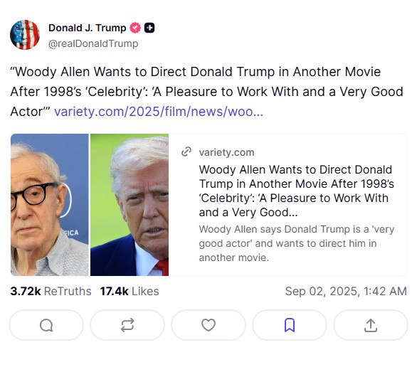 Ο Ντόναλντ Τραμπ βρήκε έναν απρόσμενο «σύμμαχο» στο πρόσωπο του Γούντι Άλεν, γεγονός που προκάλεσε πλήθος αντιδράσεων στα social media και στον Τύπο. Ο διάσημος σκηνοθέτης μίλησε στο podcast του Μπιλ Μάχερ Club Random και εξήρε την ερμηνεία του Τραμπ στη σύντομη του εμφάνιση στην ταινία Celebrity (1998). Ο Άλεν περιέγραψε τον πρόεδρο ως «ευχάριστο συνεργάτη», «ευγενικό» και «πολύ καλό ηθοποιό». Αν και τόνισε ότι διαφωνεί με τον Τραμπ «στο 99% των θεμάτων», δεν δίστασε να δηλώσει ότι θα τον σκηνοθετούσε ξανά με χαρά.