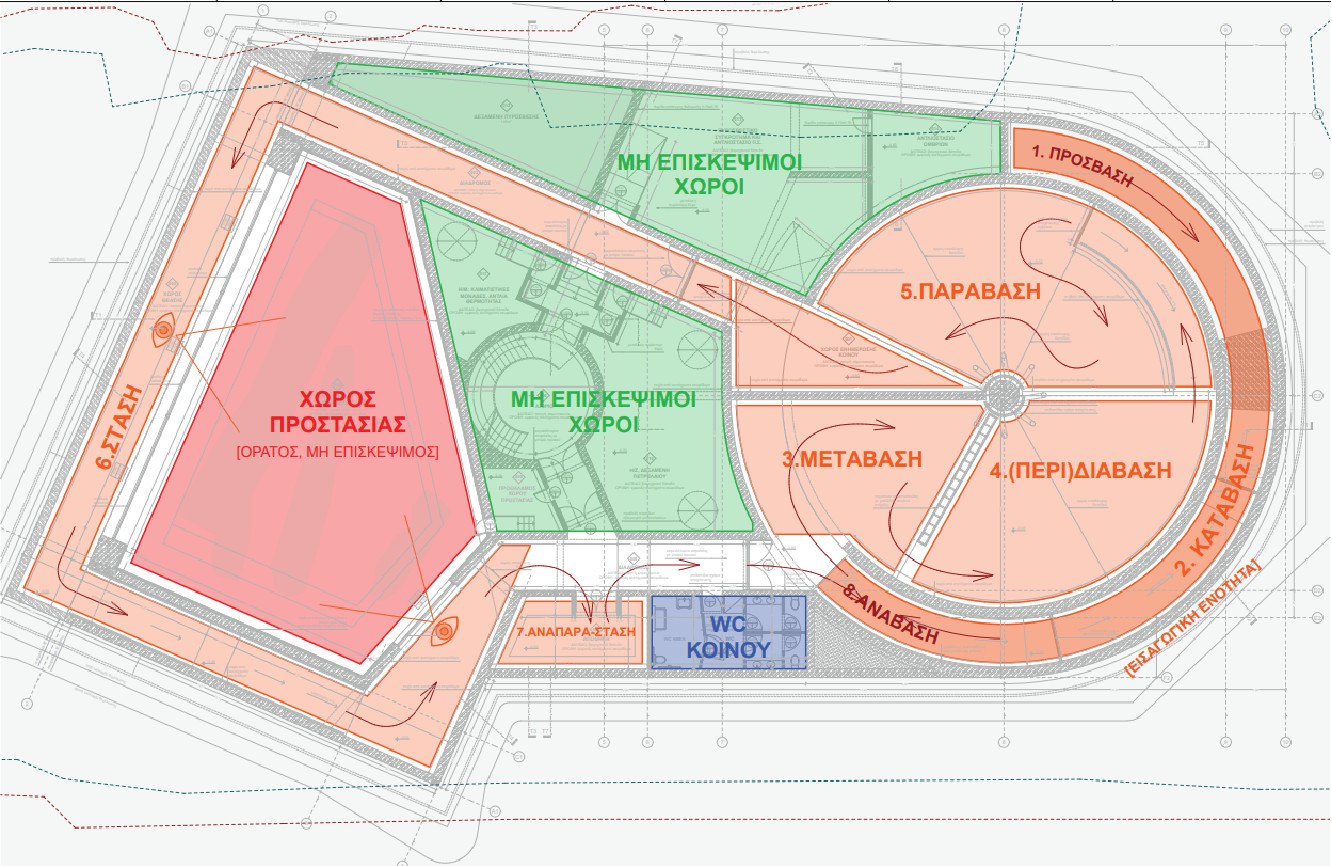 Κατάβαση/χρόνος: Η καθοδική πορεία, μέσω της ράμπας, συμβολίζει την κατάβαση στον χρόνο. Ο επισκέπτης αφήνει πίσω του τον 21ο αιώνα και το ΚΠΙΣΝ και περνά στον αρχαίο κόσμο.