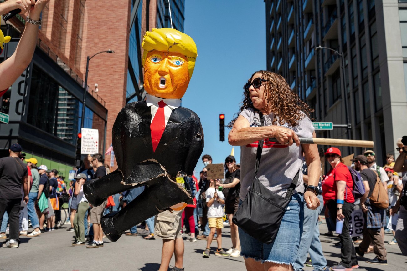 «Απελάστε τον», αναγράφεται κάτω από φωτογραφία του Ντόναλντ Τραμπ σε πλακάτ κατά τις ογκώδεις αντικυβερνητικές διαδηλώσεις τη Δευτέρα στο Σικάγο (REUTERS/Jim Vondruska)