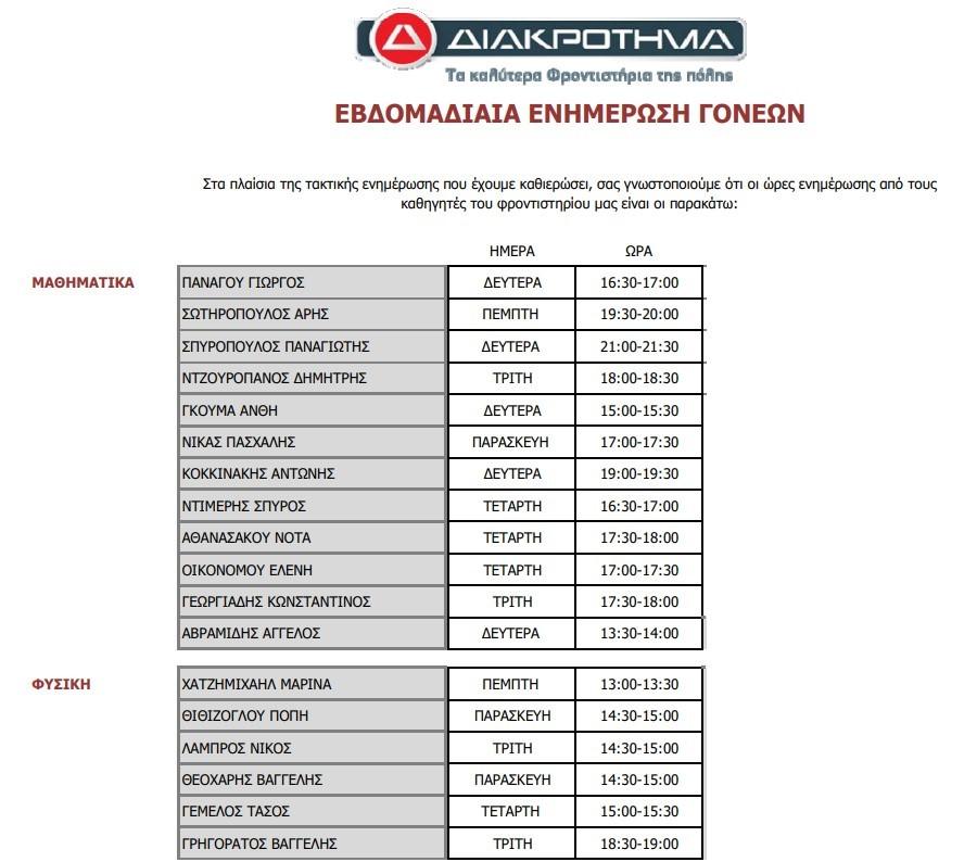 Στα φροντιστήρια ΔΙΑΚΡΟΤΗΜΑ πραγματοποιούνται ενημερώσεις γονέων σε καθημερινή βάση (με προσωπικό κωδικό γονέα μέσω διαδικτύου), σε εβδομαδιαία βάση (με πρόγραμμα καθηγητών), σε μηνιαία (τηλεφωνική επικοινωνία υπεύθυνων τμημάτων), αλλά και σε ετήσια βάση (με 3 ημέρες γονέων).