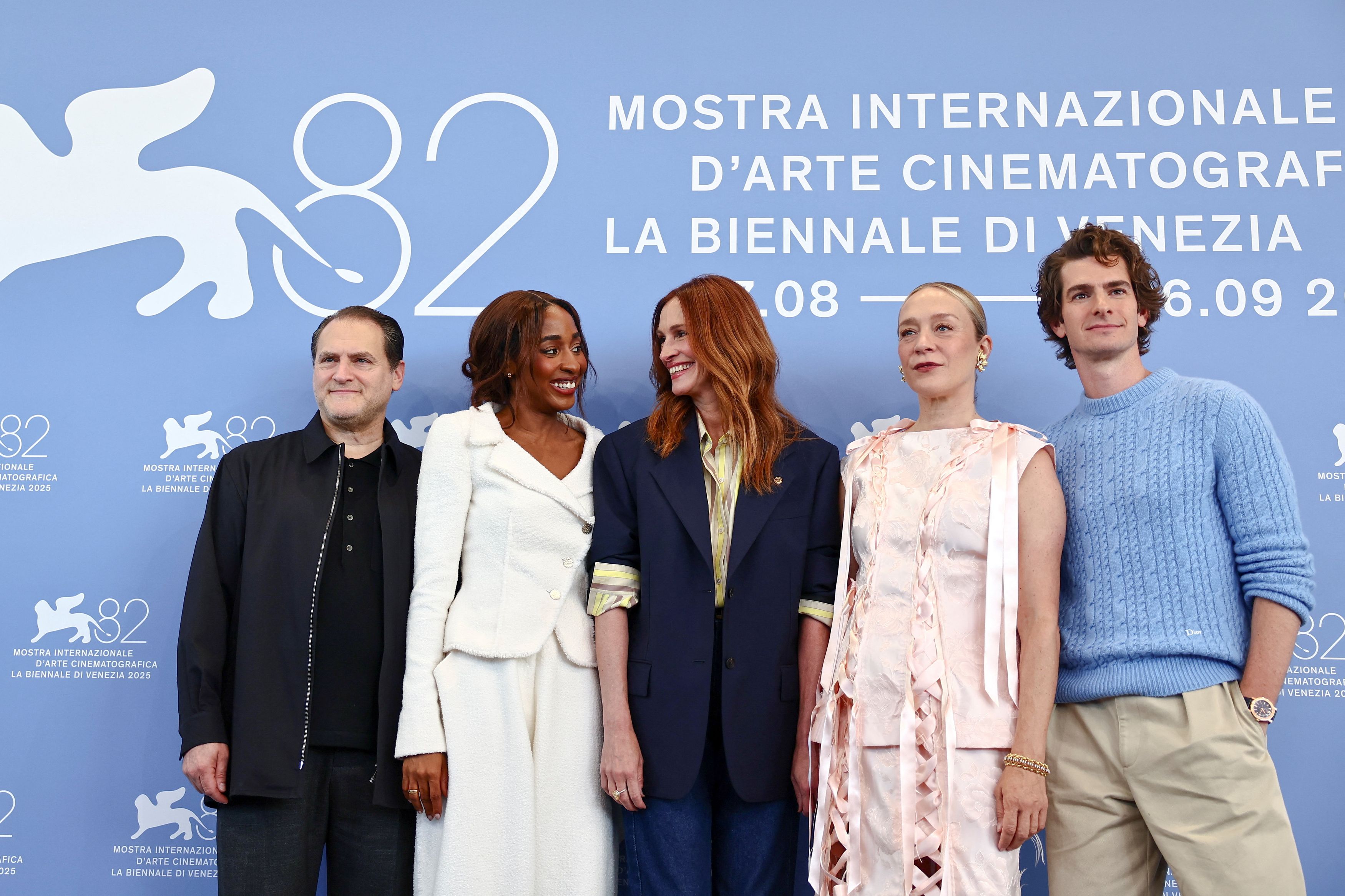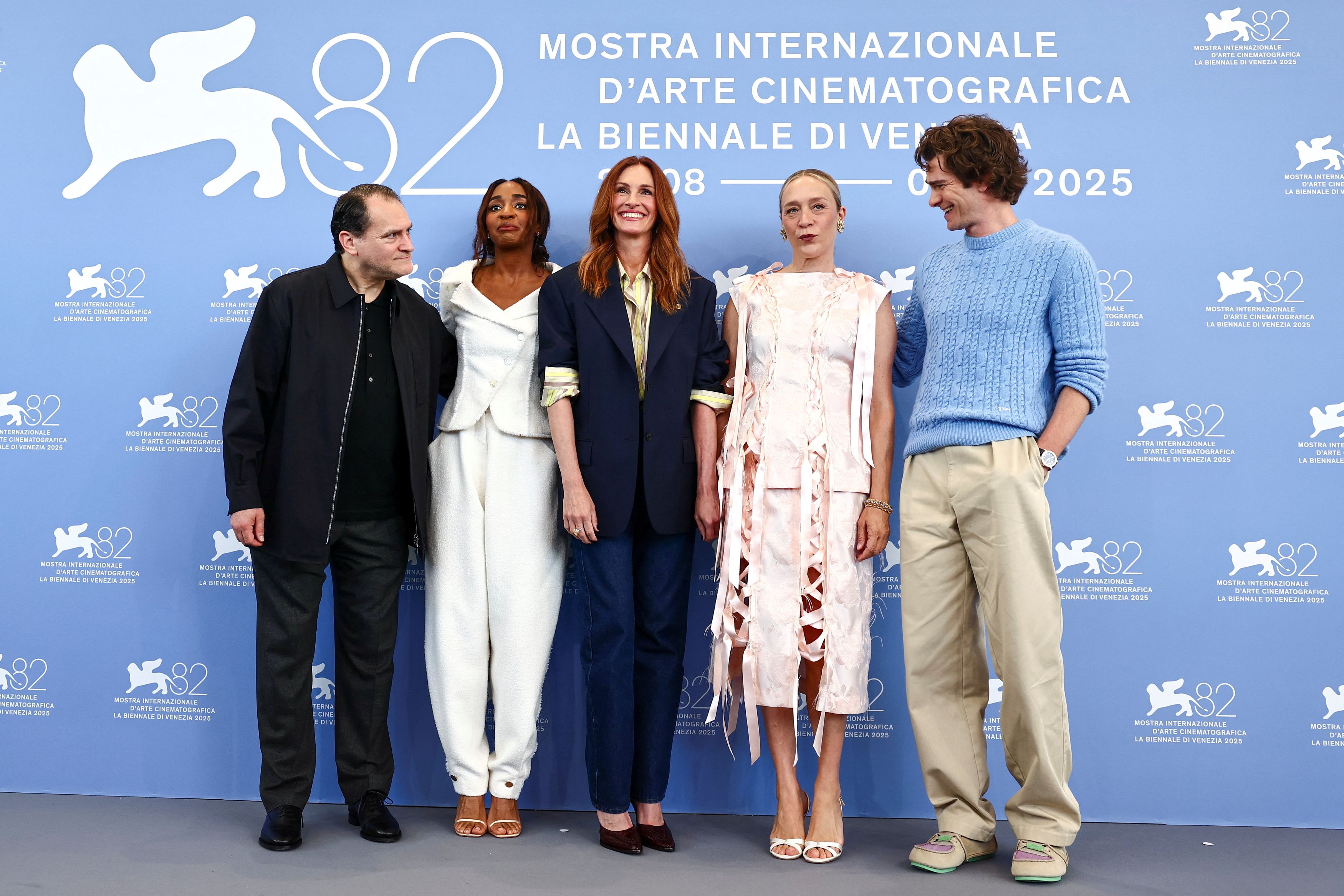 Φωτογραφία: Οι ηθοποιοί Τζούλια Ρόμπερτς, Αγιό Εντεμπίρι, Άντριου Γκάρφιλντ, Μάικλ Στούλμπαργκ και Κλόε Σεβινί φωτογραφίζονται στο 82ο Διεθνές Φεστιβάλ Κινηματογράφου της Βενετίας, Ιταλία, 29 Αυγούστου 2025. REUTERS/Yara Nardi