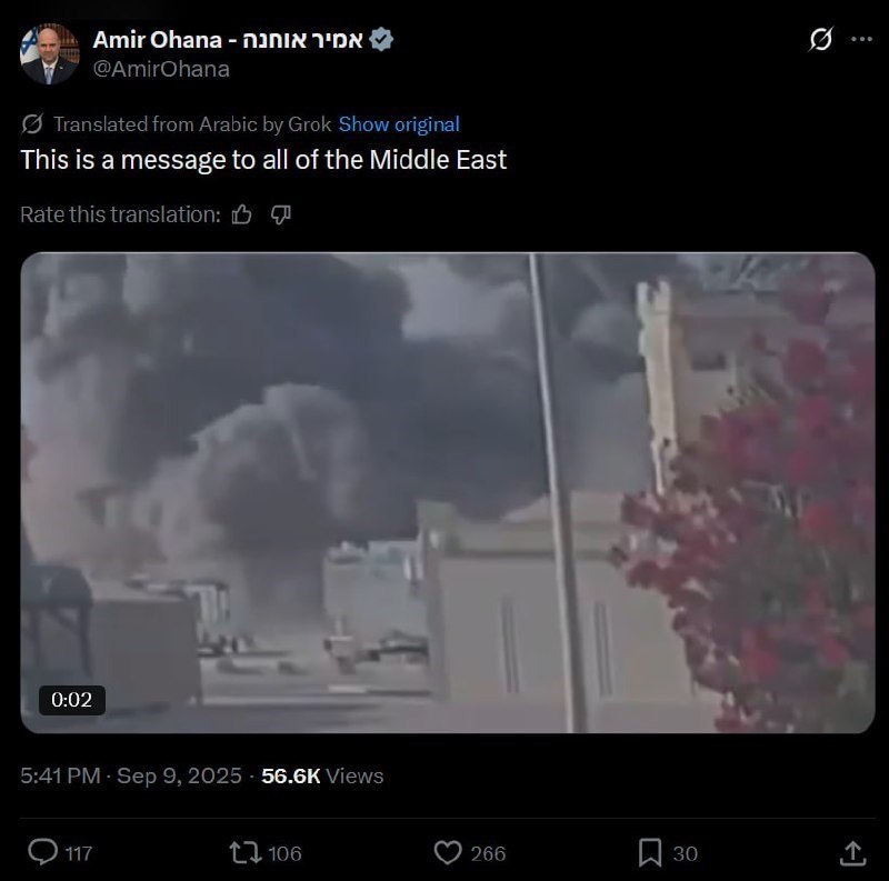 O Αμίρ Οχάνα, Πρόεδρος της Κνεσέτ, της Ισραηλινής Βουλής, αποκάλεσε την ισραηλινή επίθεση ως «μήνυμα προς όλη τη Μέση Ανατολή»