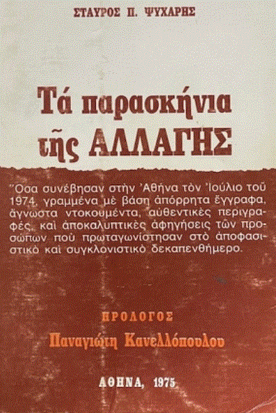 Ο Παναγιώτης Κανελλόπουλος είχε προλογίσει το βιβλίο του Σταύρου Ψυχάρη «Τα παρασκήνια της Αλλαγής» (κυκλοφόρησε το 1975 και πραγματευόταν τις άκρως δραματικές και αυτόχρημα συγκλονιστικές για τον ελληνισμό εξελίξεις του Ιουλίου του 1974), με ένα κείμενο εξόχως χαρακτηριστικό του ήθους του και της δημοκρατικής του συνείδησης.