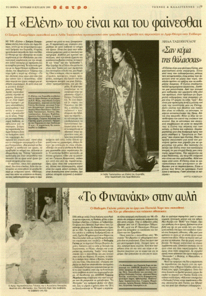 Η «Ελένη» του Ευριπίδη μέσα από την οπτική της Λήδας Τασοπούλου (εφημερίδα «Το Βήμα», Κυριακή 18 Ιουλίου 1999). Η αείμνηστη ηθοποιός και σκηνοθέτρια είχε μιλήσει στη δημοσιογράφο Μυρτώ Λοβέρδου λίγες ημέρες πριν από το ανέβασμα της παράστασης στην Επίδαυρο από το «Αμφι-Θέατρο», στις 23 και 24 Ιουλίου 1999 (η μετάφραση της «Ελένης» ήταν του Κ. Χ. Μύρη, η σκηνοθεσία του Σπύρου Ευαγγελάτου, τα σκηνικά – κοστούμια του Γιάννη Μετζικώφ, η μουσική του Γιώργου Κουρουπού και η μουσική διδασκαλία του Νίκου Βασιλείου).