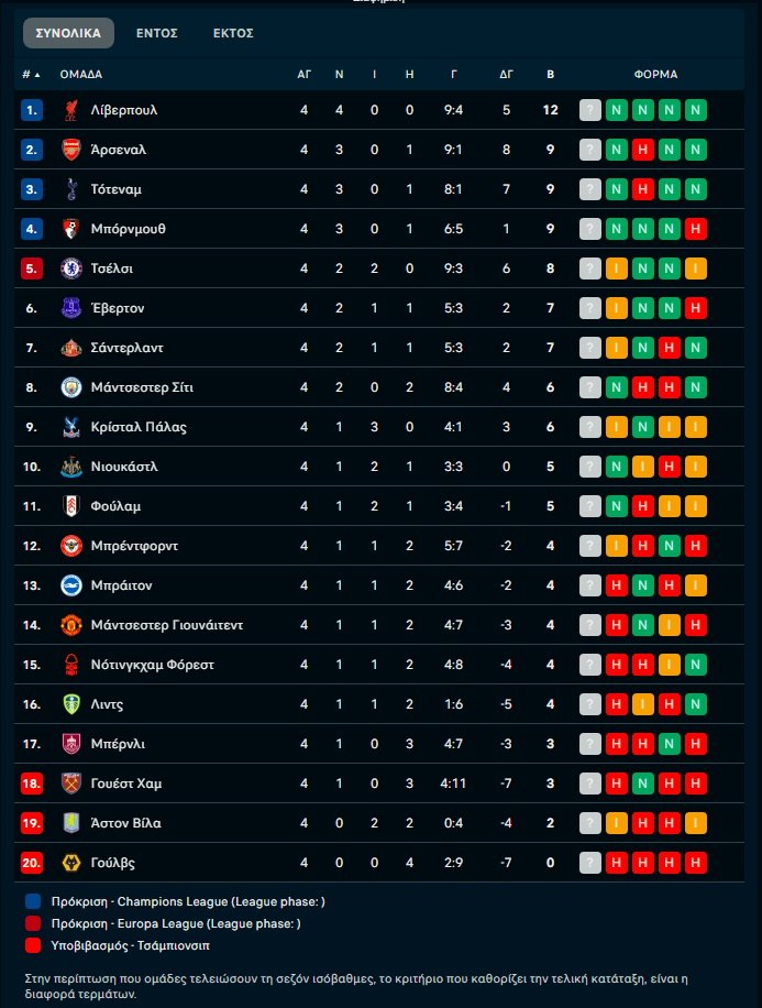 Η βαθμολογία στην Premer League (σε 4 αγωνιστικές)
