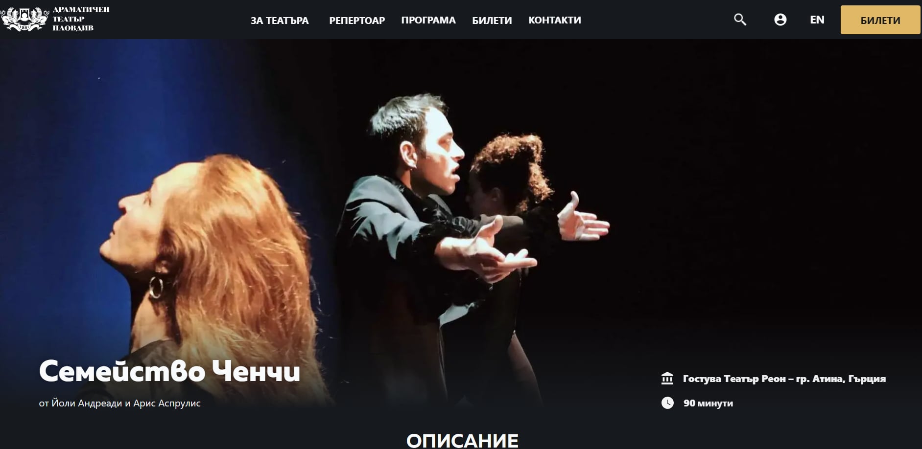 Η ελληνική παράσταση «Οικογένεια Τσέντσι» σε σκηνοθεσία Ιόλης Ανδρέαδη, με τους Κωνσταντίνα Τάκαλου, Θάνο Κόνιαρη και Έλενα Καλαϊτζή επί σκηνής, παρουσιάζεται απόψε το βράδυ στο «Crossroads Stage Autumn Theater Festival», το επίσημο φεστιβάλ του Δραματικού Θεάτρου της Φιλιππούπολης (Plovdiv Drama Theater).