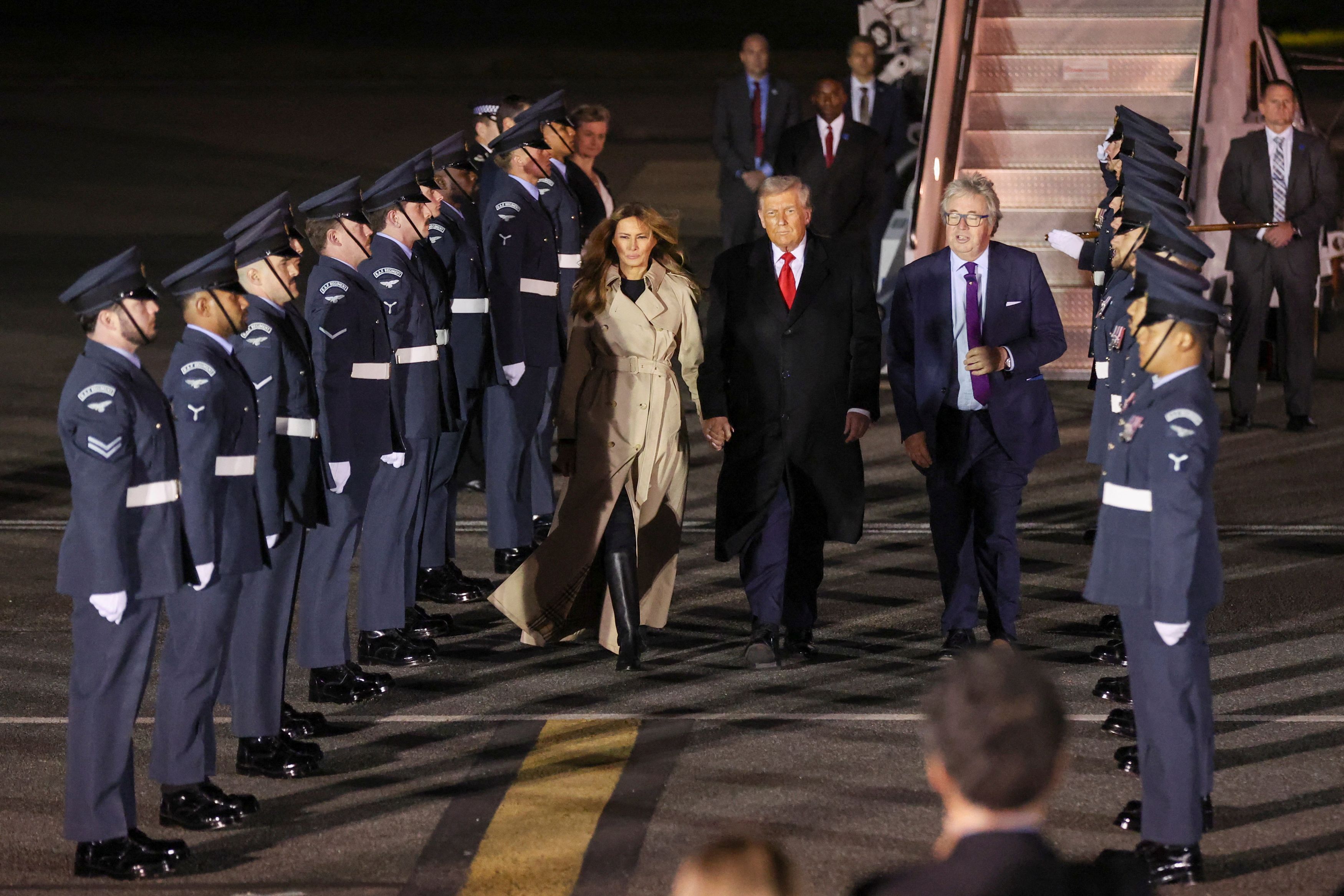 Η Μελάνια Τραμπ φόρεσε το πιο βρετανικό της outfit και μαύρα γυαλιά ηλίου, ξεκινώντας για το τριήμερο ταξίδι στην Αγγλία, κρατώντας τον σύζυγό της από το χέρι. Για την επόμενη εμφάνισή της επέλεξε ένα δραματικό, μεγάλο καπέλο, παρόμοιο με εκείνο της ορκομωσίας του Ντόναλντ Τραμπ.