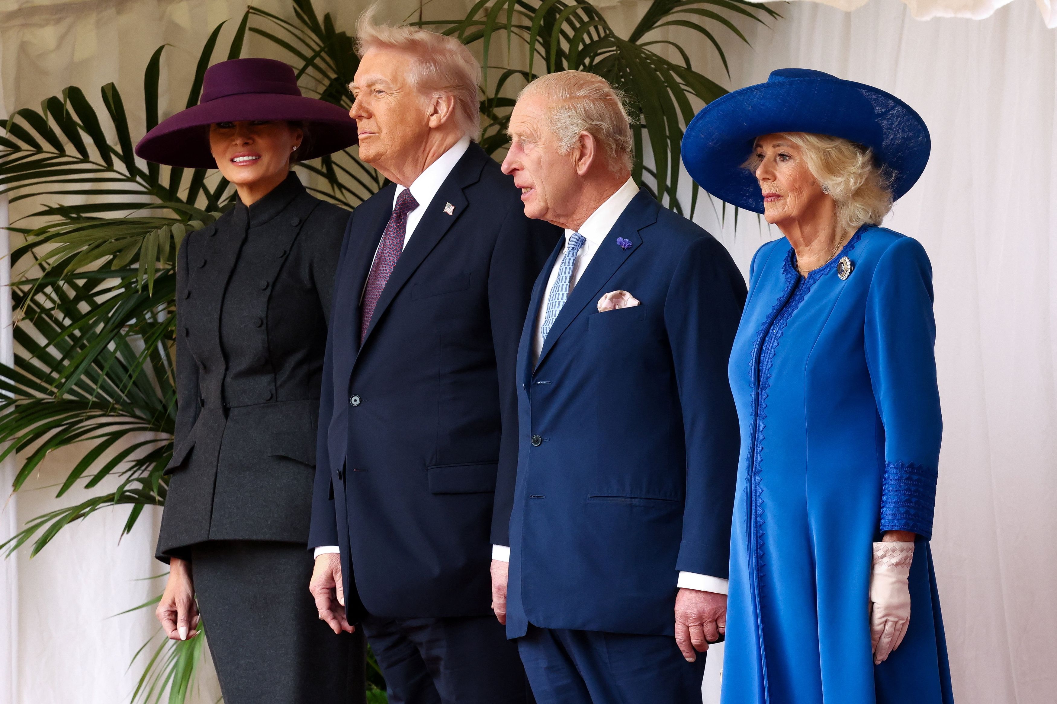 Ο βασιλιάς Κάρολος Γ’ και η βασίλισσα Καμίλα υποδέχτηκαν επίσημα το προεδρικό ζεύγος των ΗΠΑ, ενή η Μελάνια Τραμπ έκανε μια δεύτερη εμφάνιση με δραματικό καπέλο, με μεγάλο γείσο που έκρυβε ξανά τα μάτια της, παρόμοιο με αυτό που είχε φορέσει στην ορκομωσία του συζύγου της για τη δεύτερη θητεία του.