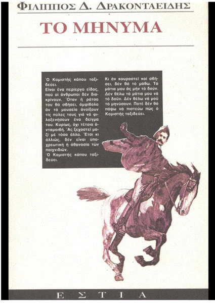 Το βιβλίο του Φίλιππου Δρακονταειδή «Το Μήνυμα» (διήγησις διδακτική εκ πολλών συρραφείσα) είχε κυκλοφορήσει το 1990 από τις εκδόσεις «Εστία».