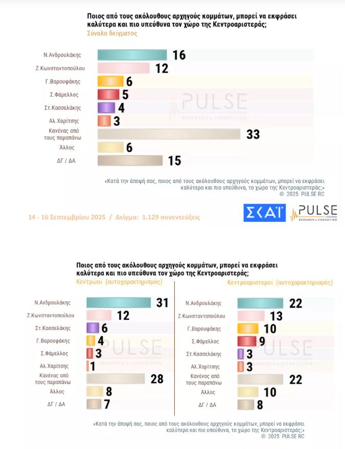 Η δημοσκόπηση της Pulse έθεσε και το ερώτημα για τον καλύτερο εκφραστή της Κεντροαριστεράς, στο πλαίσιο της συζήτησης για τη δημιουργία ενός φορέα, που θα περιλαμβάνει όλα τα κόμματα από το κέντρο προς τα αριστερά, ως αντιστάθμισμα στη δυναμική της Νέας Δημοκρατίας.