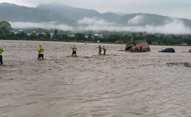 Οπτικό υλικό δείχνει λασπόνερα να έχουν κατακλύσει χθες την πόλη Σαχαστραντχάρα, στην περιοχή Ντεχραντούν, προκαλώντας καταστροφές σε καταστήματα, δρόμους και κατοικίες και πολίτες να προσπαθούν να βρουν καταφύγιο.