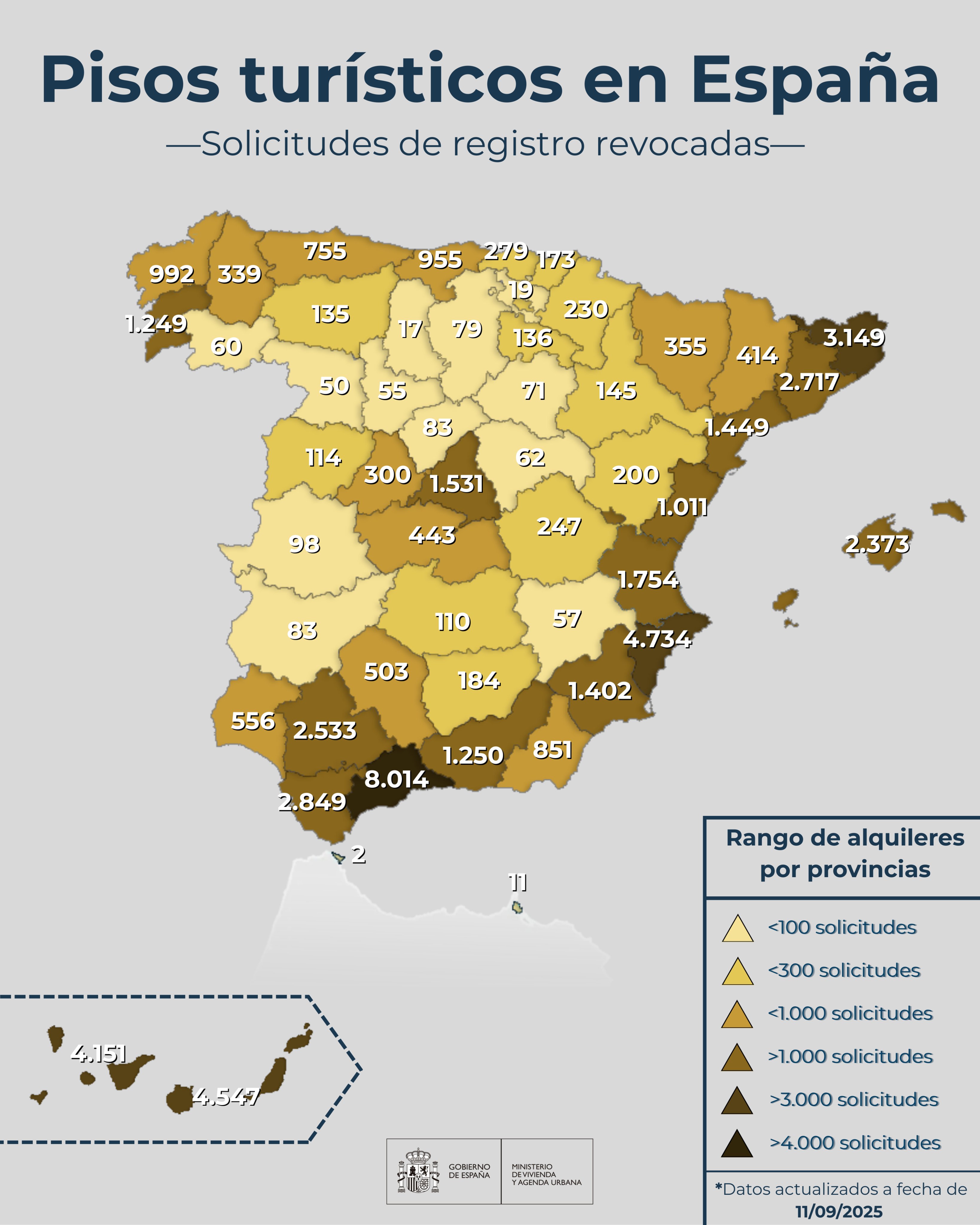 Η Ανδαλουσία βρίσκεται στην κορυφή της λίστας των περιοχών με τις περισσότερες ανακληθείσες εγγραφές τουριστικών κατοικιών, με 16.740 περιπτώσεις. Ακολουθούν οι Καναρίες Νήσοι με 8.698, η Καταλονία με 7.729, η Βαλένθια με 7.499, η Γαλικία με 2.640, οι Βαλεαρίδες Νήσοι με 2.373, η Μαδρίτη με 1.531 και η Μούρθια με 1.402.