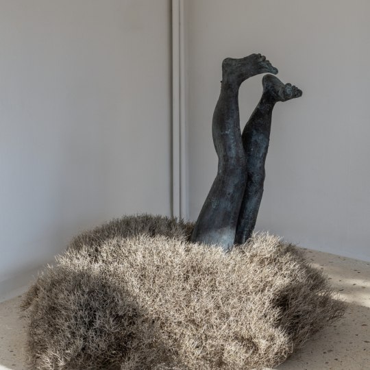 Τα υλικά πολλών έργων της έκθεσης Θέρος, Τρύγος, Πόλεμος που έχει ετοιμάσει ο γλύπτης Αργύρης Ραλλιάς ταξίδεψαν. Το ξεραμένο θυμάρι της Τελευταίας Βουτιάς, για παράδειγμα, ή οι πέτρες πάνω στις οποίες αγκαλιάζονται, αλλά και στριμώχνονται τα συμπλέγματα ανθρώπων στις Φρυκτωρίες έπλευσαν από τον γενέθλιο τόπο του, την Κύθνο, για να εγκατασταθούν στο Studio Contrapposto στα Πετράλωνα (Θεσσαλονίκης 185) που από το Σάββατο 20 Σεπτεμβρίου φιλοξενεί την έκθεση με την οποία ο γλύπτης προβληματικοποιεί και επεξεργάζεται ένα σύγχρονο ζήτημα που είδε να αλλοιώνει όλα όσα του ήταν γνώριμα: τον υπερτουρισμό.