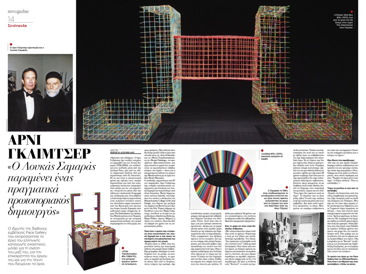Το τεύχος φιλοξενεί επίσης τον Άρνι Γκλίμτσερ, ιδρυτή της ιστορικής Pace Gallery, ο οποίος μιλά για τη σχέση του με τον εικαστικό Λουκά Σαμαρά, για την επικαιρότητα του έργου του και για την τέχνη που ανοίγει δρόμους.