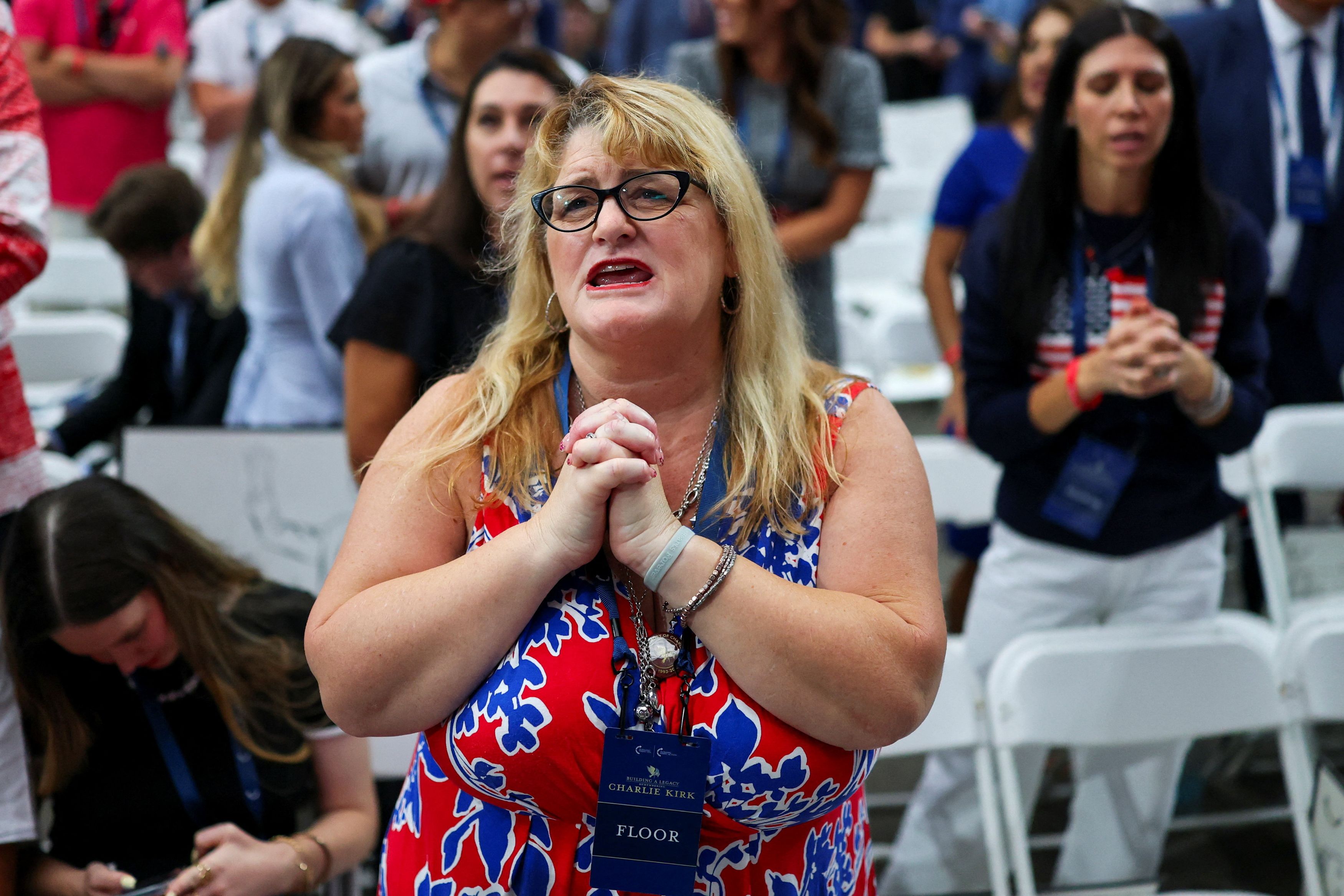 People sing pray songs as they gather to attend a memorial service for slain conservative commentator Charlie Kirk at State Farm Stadium, in Glendale, Arizona, U.S., September 21, 2025. REUTERS/Caitlin O’Hara