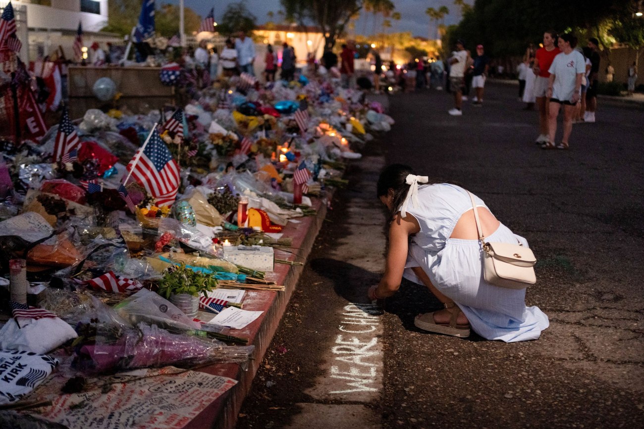 Μια γυναίκα γράφει με κιμωλία «WE ARE CHARLIE» καθώς επισκέπτεται το μνημείο για τον δολοφονημένο ακροδεξιό ακτιβιστή Τσάρλι Κερκ, στα κεντρικά γραφεία της Turning Point USA, στο Φοίνιξ της Αριζόνα, ΗΠΑ, 21 Σεπτεμβρίου 2025