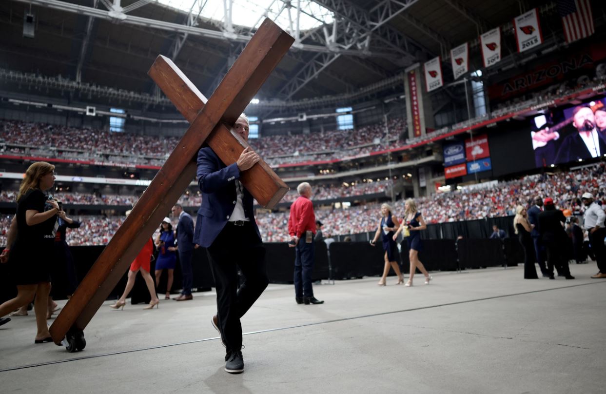 Ένας γραβατωμένος άνδρας να σέρνει έναν πελώριο σταυρό, καλλίγραμμες με formal chic φόρεμα που ύψωναν τα χέρια τους στον ουρανό και πιο ψηλά από όλους, μια θλιμμένη ξανθιά ντυμένη στα άσπρα γυναίκα που αγκάλιαζε σφιχτά τον πρόεδρο Ντόναλντ Τραμπ. Η τελευταία ήταν η χήρα του δολοφονημένου Τσάρλι Κερκ και όλα αυτά ήταν κάτι παραπάνω από το πλαίσιο μιας πατροπαράδοτης εκδήλωσης μνήμης του των Ρεπουμπλικάνων στην Αριζόνα.