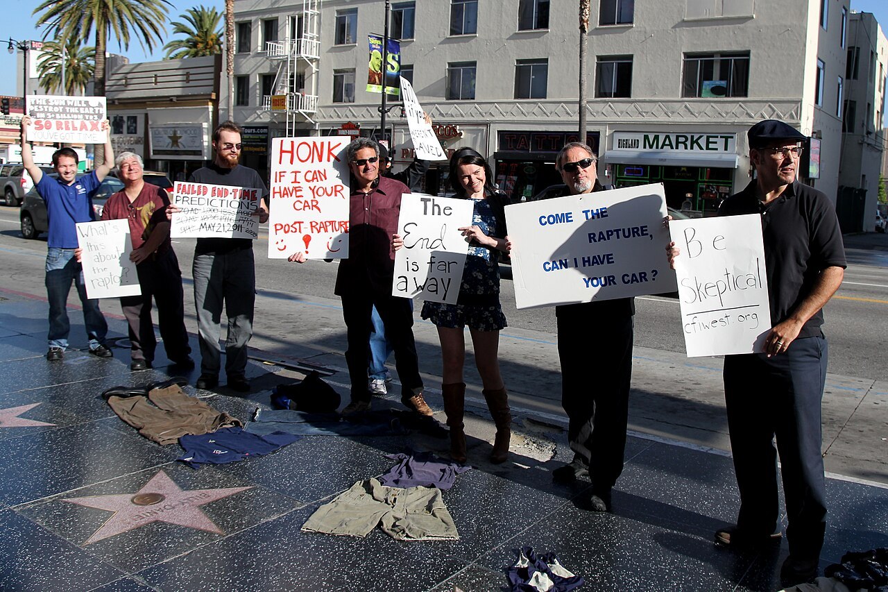 Μέλη της σκεπτικιστικής ομάδας IIG διαμαρτύρονται κατά της πρόβλεψης του Χάρολντ Κάμπινγκ για το τέλος του κόσμου στη λεωφόρο Χόλιγουντ στις 21 Μαΐου 2011.