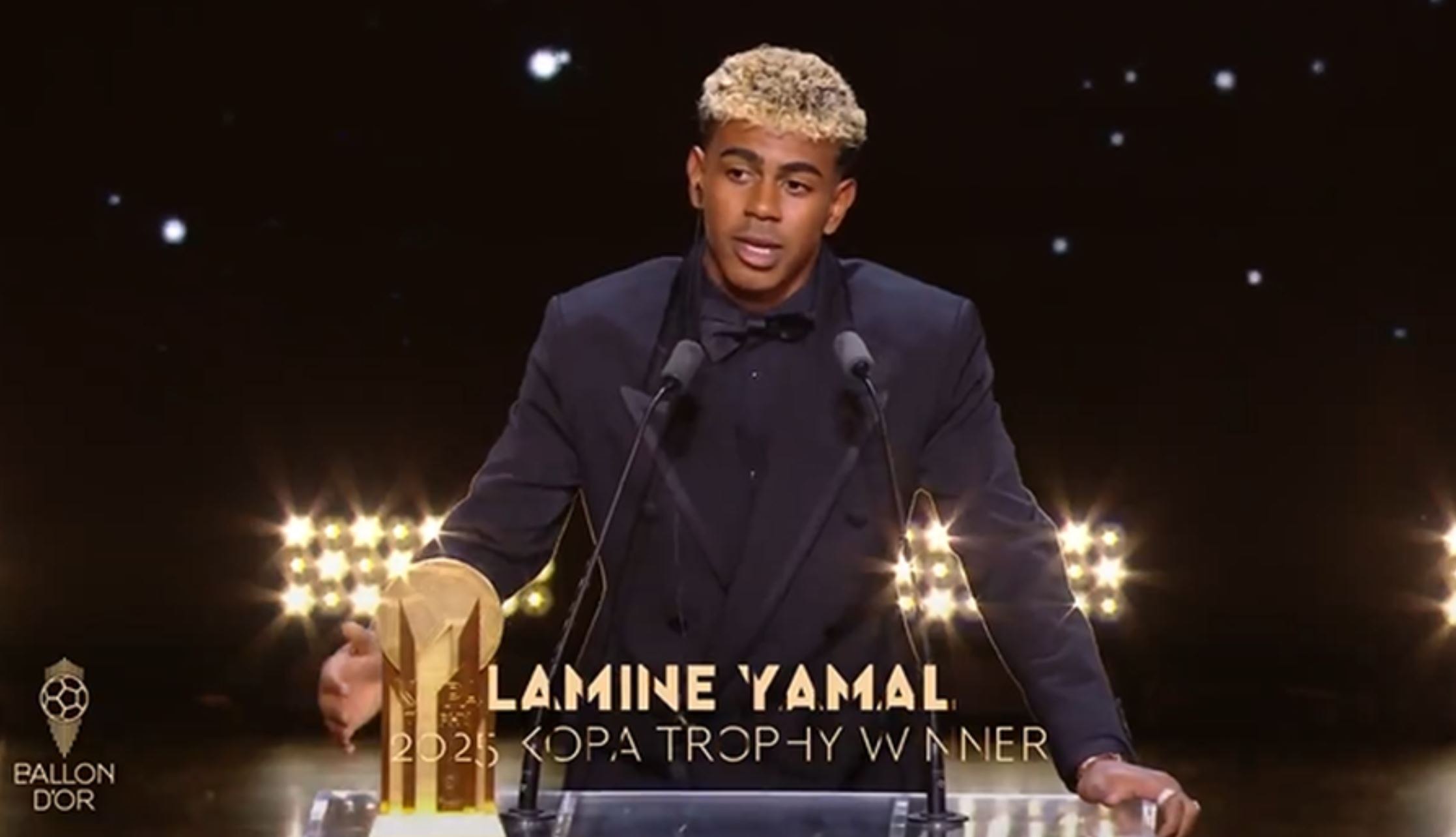 Έπαθλο που κατέληξε στα χέρια του Ουσμάν Ντεμπελέ. Ο Γιαμάλ, χαρούμενος που κατέκτησε το «βραβείο Kopa», του καλύτερου νέου παίκτη για δεύτερη συνεχή χρονιά, δεν ξέχασε να συγχαρεί τον Ντεμπελέ.