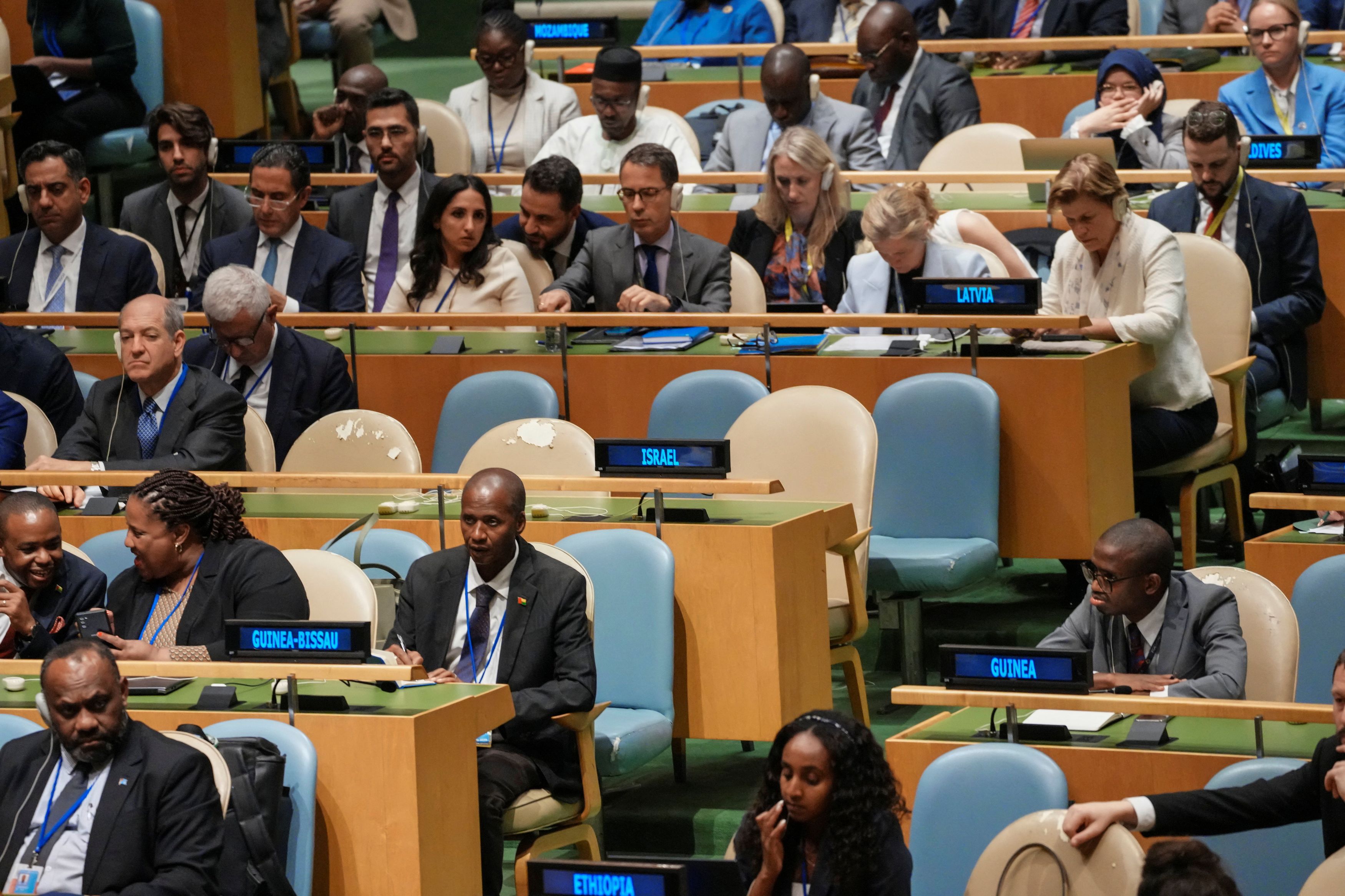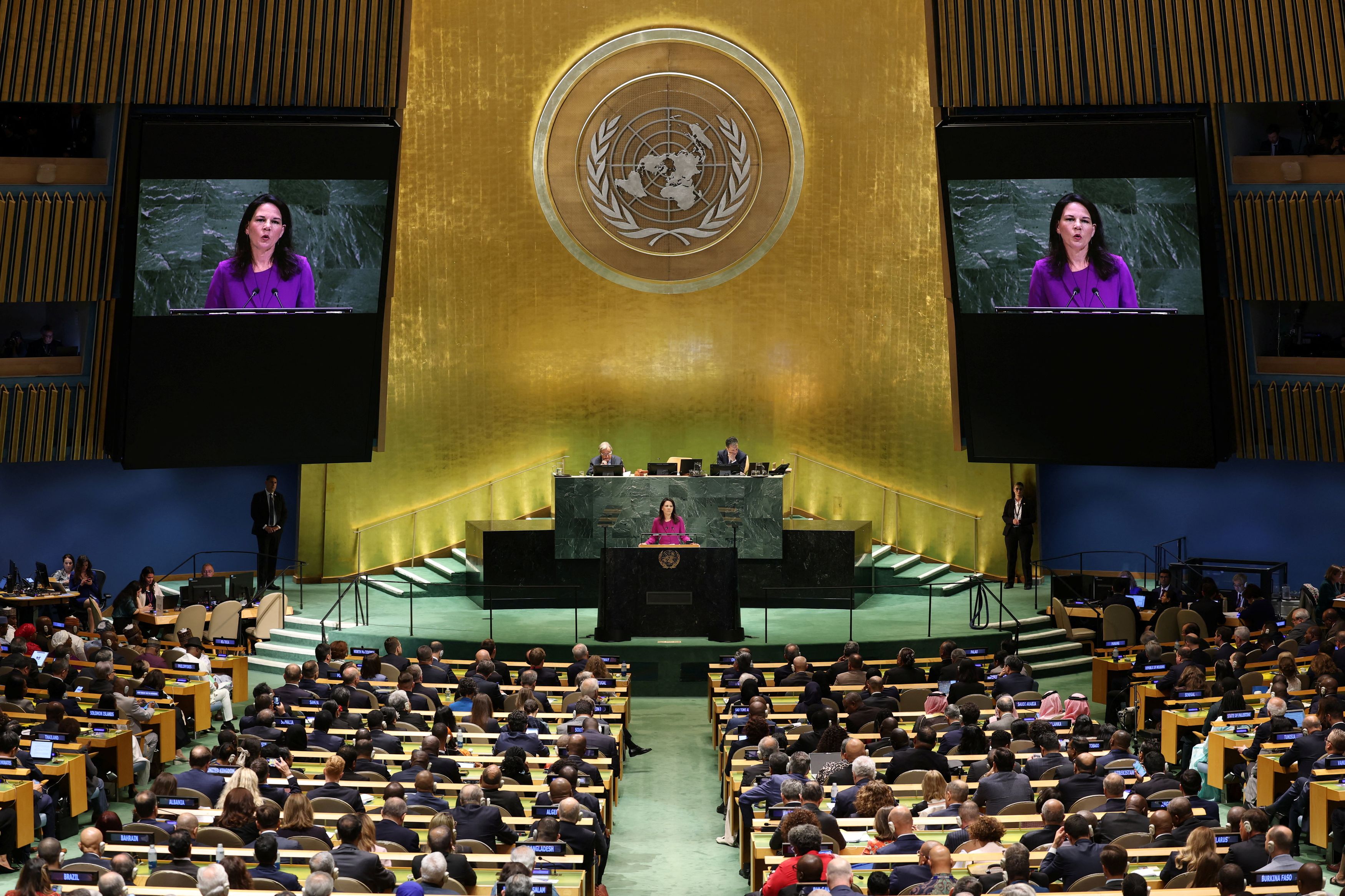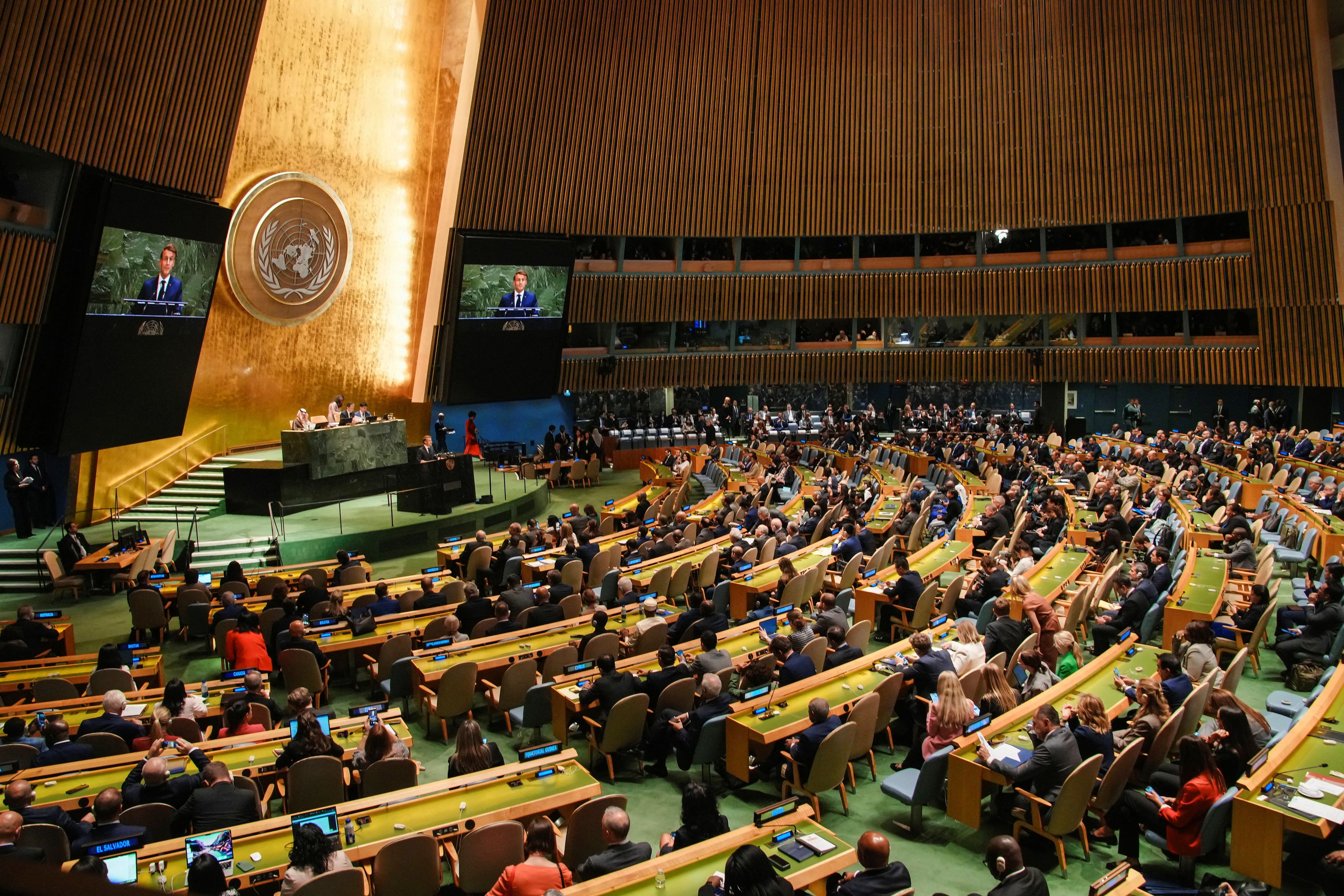 Τα άδεια έδρανα του Ισραήλ στη Γ.Σ. του ΟΗΕ, κατά την ομιλία Μακρόν