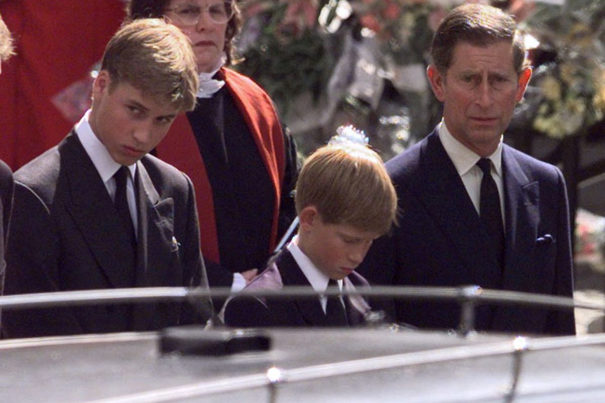 Ο Πρίγκιπας Κάρολος, ο Πρίγκιπας Χάρι, ο Κόμης Σπένσερ, ο Πρίγκιπας Γουίλιαμ και ο Δούκας του Εδιμβούργου παρακολουθούν τη μεταφορά του φέρετρου με τη σορό της Πριγκίπισσας Νταϊάνα στο Αββαείο του Γουέστμινστερ για την κηδεία της στις 6 Σεπτεμβρίου