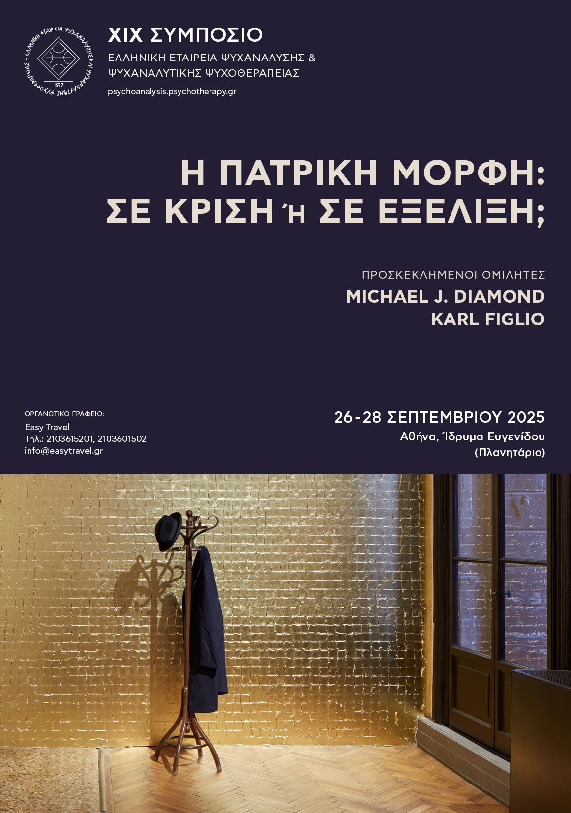 «Η πατρική μορφή: Σε κρίση ή σε μετάβαση;» είναι το θέμα του φετινού, 19ου συνεδρίου της Ελληνικής Εταιρείας Ψυχανάλυσης και Ψυχαναλυτικής Ψυχοθεραπείας (ΕΕΨΨ) που ξεκίνησε σήμερα Παρασκευή 26 Σεπτεμβρίου και ολοκληρώνεται το Σάββατο 28, στο Ευγενίδειο Ίδρυμα (Πλανητάριο).